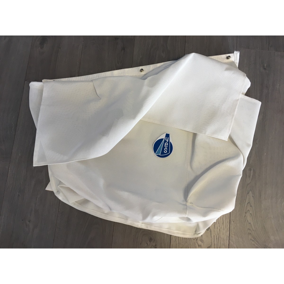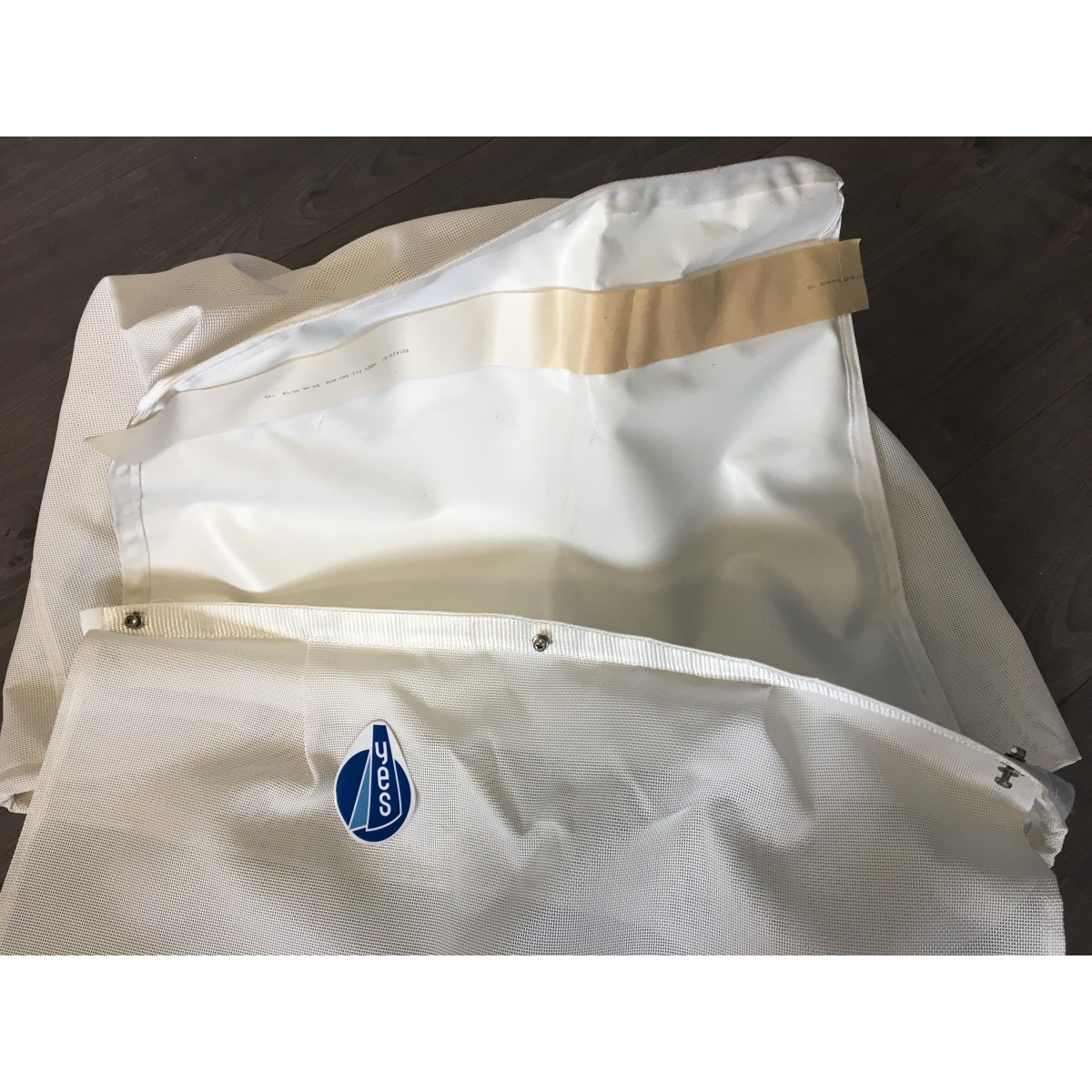 En tissus mesh blanc avec fixation par 3 vis et adhésif velcro au dos.