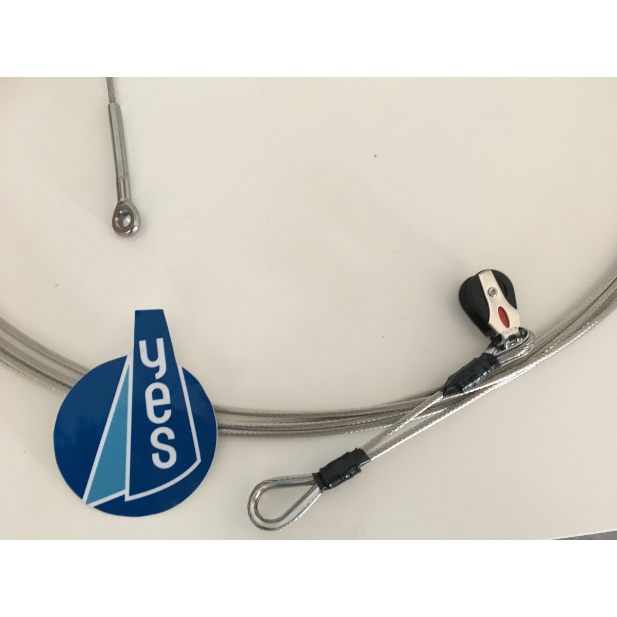 Cable inox de 3mm avec cosse de 5mm et oeil + estrope en cable avec une poulie pour la drisse de foc (Ronstan 20101)