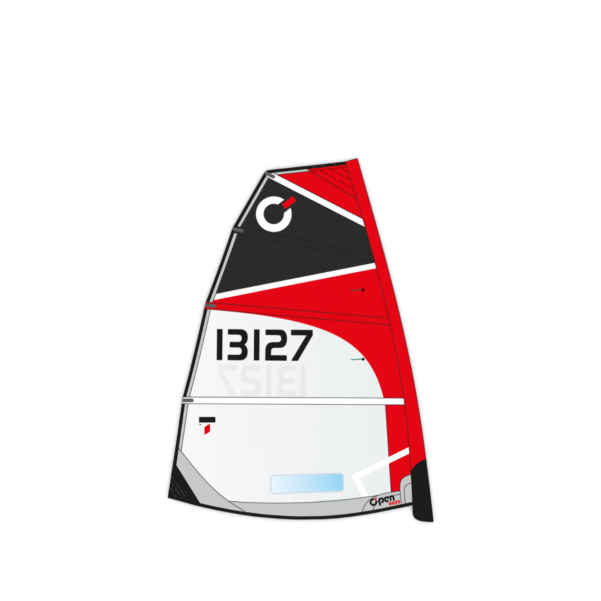 Gréement complet O’pen Skiff One Design avec voile monofilm de 4,5 m, lattes, mât, bôme et écoute, hale-bas de cunningham/bôme.